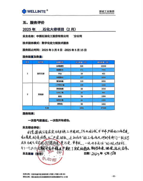 源诚工业依托零泄漏生态服务(LES)平台为石化工厂常减压装置、渣油加氢装置、加氢裂化装置、芳烃联合装置等约1600 余对法兰实施数字化定力矩技术服务。项目投入专业技术人员 15人次,使用液压拉伸器、各类型液压扳手、电动扭矩扳手等施工机具共300余套。